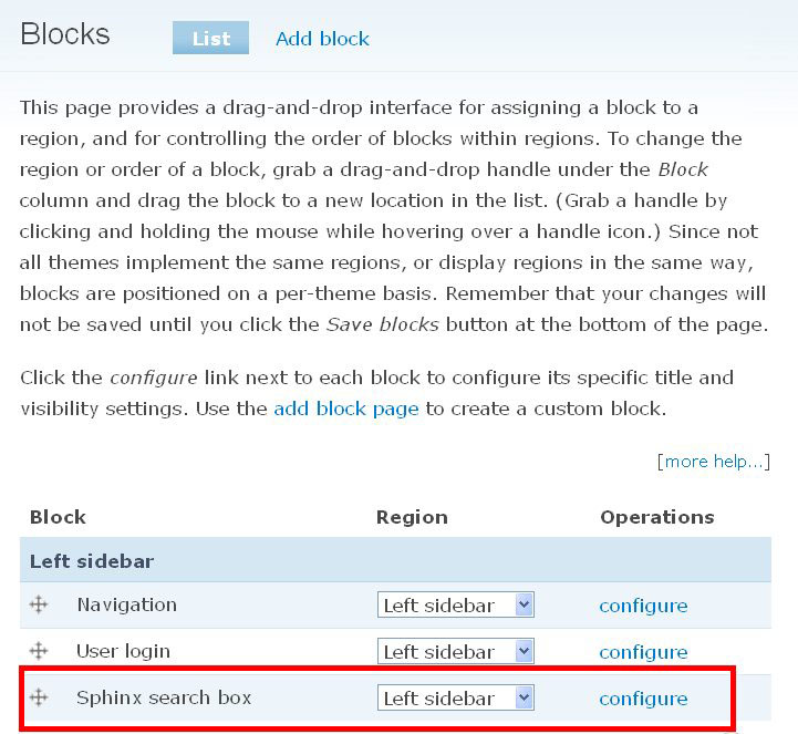 - Выведите на странице администрирования блоков admin/build/block блок Sphinx search box - с помощью этого блока пользователи смогут искать контент на Вашем сайте.